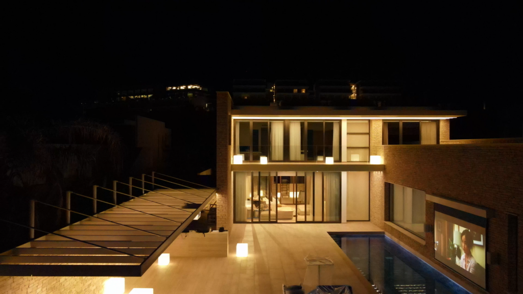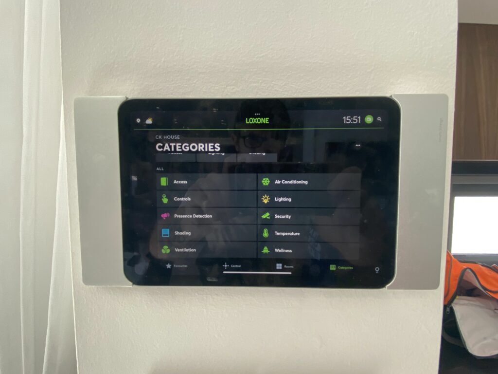 Управление домом: внутреннее и уличное освещение, шторы и моторизованные роллы, климат (кондиционеры и тёплые полы), аудио мультирум, ворота, управление доступом через автомобиль, управление водопадами и противотоком в бассейне